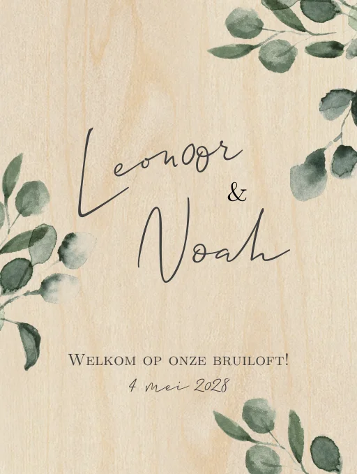 Dit houten welkomstbord met blaadjes maakt deel uit van de trouwkaartenset.