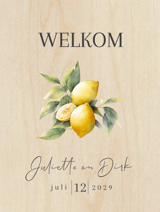 Een houten welkomstbord zet je aan het begin van jullie bruiloft neer om de gasten welkom te heten. Dit is een trend welkomstbord van hout met citroentjes.