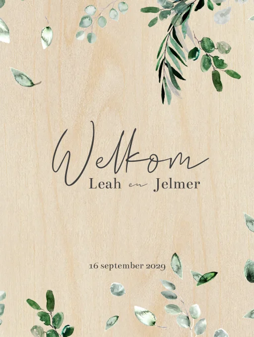 Deze houten welkomstbord met eucalyptustakjes maakt deel uit van de trouwkaartenset.