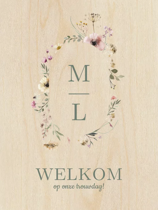 Dit houten welkomstbord met bloemenkrans maakt deel uit van de trouwkaartenset.