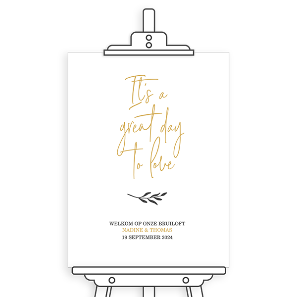 Dit welkomstbord met goudlook maakt deel uit van een trouwkaartenset.