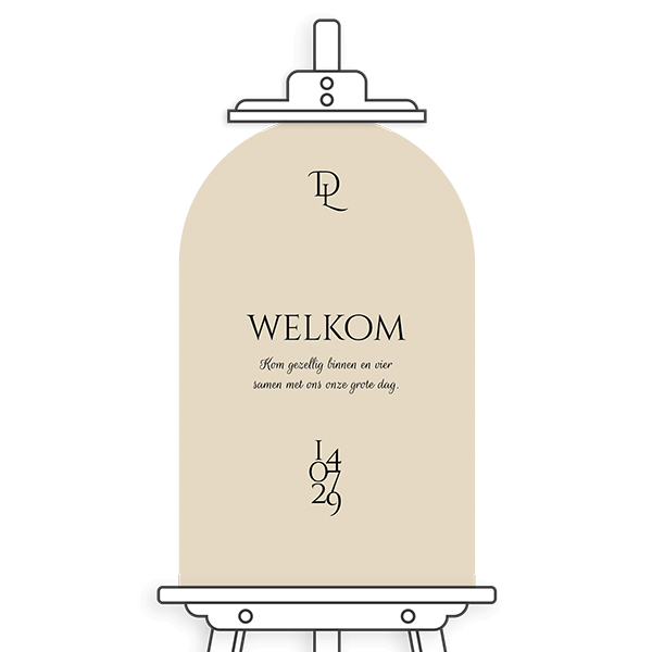 Dit is een modern welkomstbord bruiloft in boogvorm. Pas zelf de teksten aan naar wens. Zo heet je gasten hartelijk welkom op jullie grote dag.Maak het bijpassend bij jouw kaart Personaliseer met zelfgekozen afbeeldingen en teksten Weersbestendig materiaal