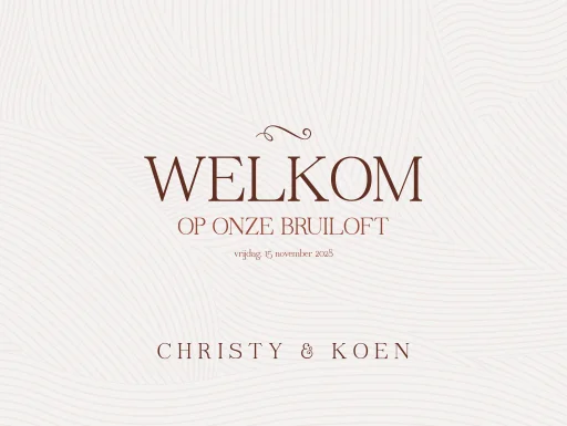 Met een welkomstbord heet je gasten hartelijk welkom op je bruiloft. Dit is een origineel, liggend welkomstbord. Het bord hoort bij een bijpassende trouwkaart, zo bestel je alles in dezelfde stijl.| Totaalprijs: 0 |