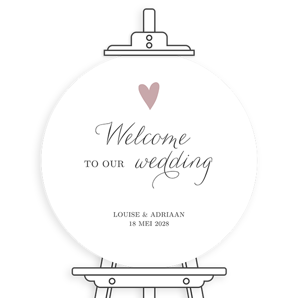 Dit welkomstbord met hartje past bij de trouwkaart met lakzegel. Bekijk deze kaart op onze pagina met trouwkaarten en lakzegels. Voor een andere vorm bord kunt je contact met ons opnemen. Je kunt dit welkomstbord aanpassen naar eigen wens.Maak het bijpassend bij jouw kaart Personaliseer met zelfgekozen afbeeldingen en teksten Weersbestendig materiaal