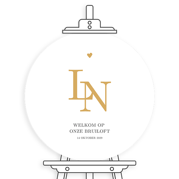 Ontwerp een rond welkomstbord met logo en hartje voor jullie bruiloft. Zo ontvang je gasten op een hartelijke manier. Dit bord past bij een trouwkaart in dezelfde stijl.Maak het bijpassend bij jouw kaart Personaliseer met zelfgekozen afbeeldingen en teksten Weersbestendig materiaal
