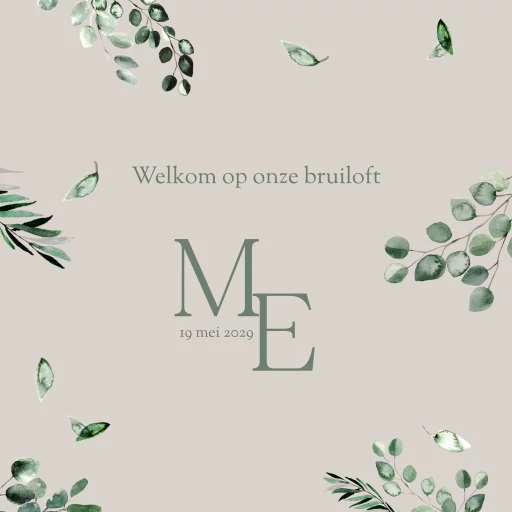 Passend bij alle drukwerk kun je een welkomstbord maken voor aan het begin van de bruiloft. Dit is een vierkant welkomstbord met eucalyptusblaadjes.In stijl van jullie trouwdrukwerk Stevig en weerbestendig materiaal Ruime beeldbank met unieke beelden Persoonlijke hulp - 085-743 0766