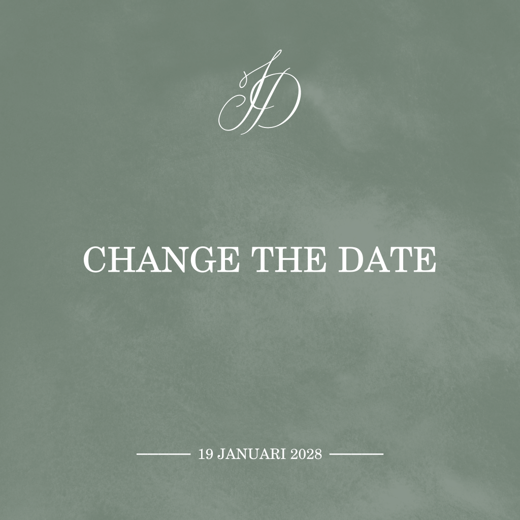 Maak een mooie donkergroene Change the Date kaart voor jullie bruiloft. De achtergrond is donkergroen, maar kan aangepast worden naar elke gewenst kleur. Op de voorkant en achterkant wordt folie gedrukt. Je kunt ook voor een andere kleur folie kiezen in de kaartopmaker. Bij deze Change the Date the Date hebben we een bijpassende trouwkaartenset.