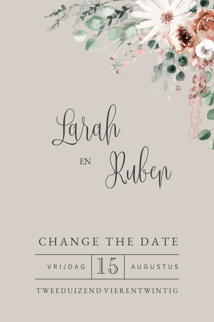 Maak een beige Change the Date kaart met dit leuke bloemenkransje. In de vakjes kun je jullie nieuwe trouwdatum plaatsen. Op de achterkant schrijf je een persoonlijke tekst.
