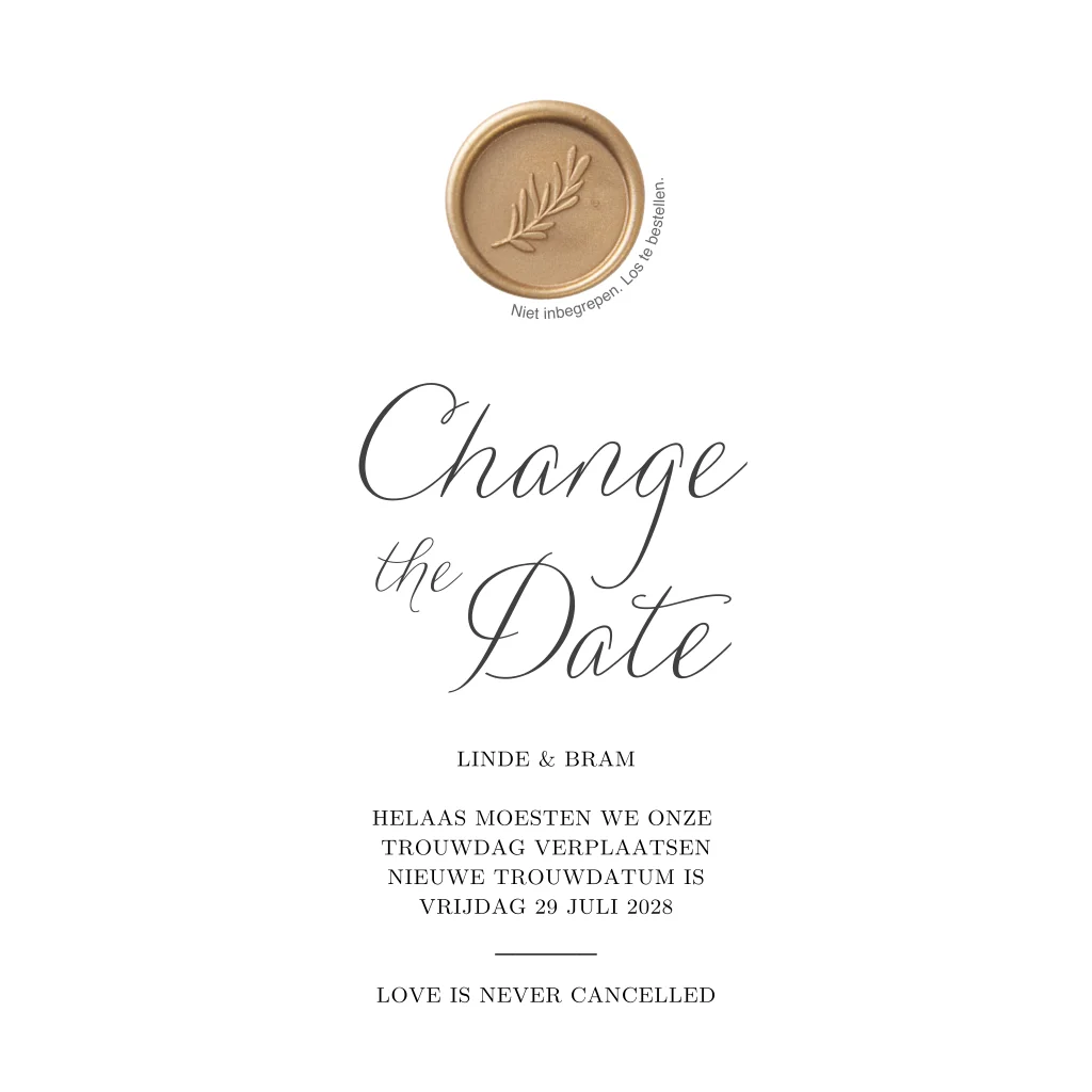LET OP: De lakzegels bestel je apart bij de kaarten. Je kunt tijdens het bestellen van de Change the Date kaarten de lakzegels bestellen per 25 stuks. Je plakt deze thuis met de handig plakstrip op de trouwuitnodiging.