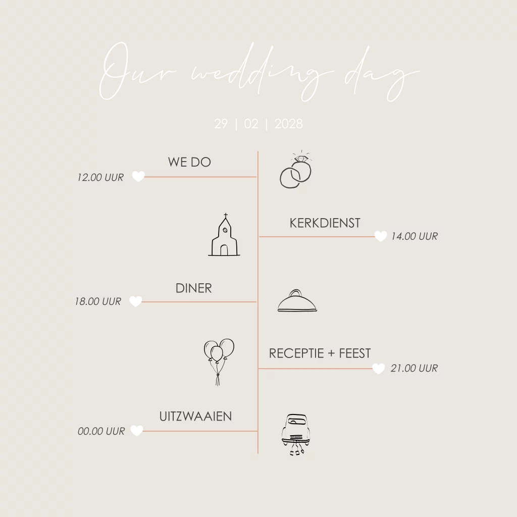 Deel aan de daggasten op jullie trouwdag dit programmakaartje uit. Dit is een dagprogrammakaartje bruiloft met icoontjes en roséfolie.Totaalprijs: 0 |