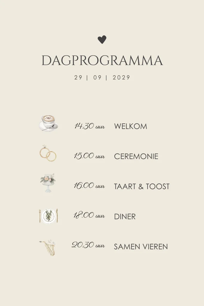 Bestel een beige dagprogrammakaartje om uit te delen op de trouwdag. Op dit dagprogrammakaartje bruiloft wordt jullie dagprogramma weergegeven met icoontjes. Maak eenvoudig jullie bruiloft programma met icoontjes uit de beeldbank.