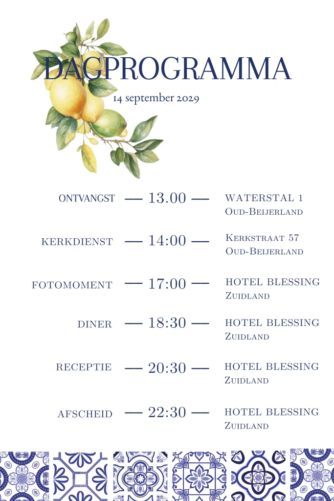 Ontwerp een dagprogrammakaartje met citroentjes en italiaanse tegeltjes. Dit kaartje deel je uit op de trouwdag, zo weten de daggasten hoe het programma van de dag eruit ziet. Dit kaartje in Italië stijl past bij een trouwkaart in dezelfde stijl.