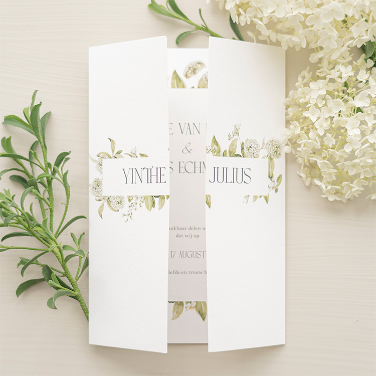 Een elegante trouwkaart met botanisch ontwerp. Pas de kaart aan naar wens in onze online editor. Dit is een drieluik trouwkaart, de flapjes vouw je naar binnen toe als deurtjes. Maak met de icoontjes het dagprogramma van jullie trouwdag.