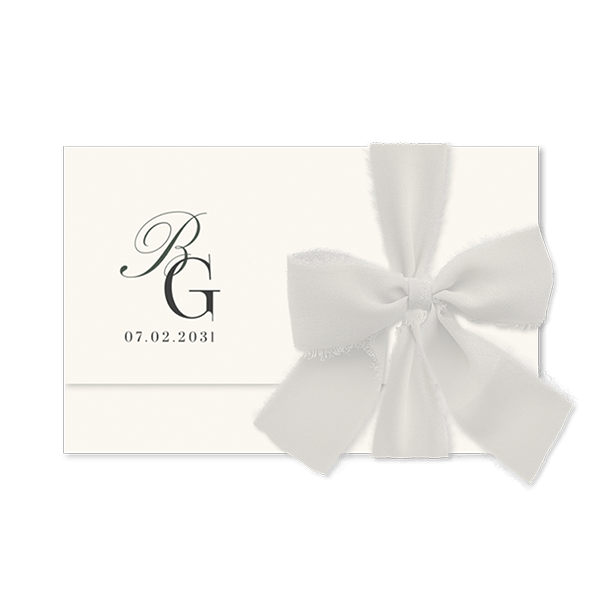 Ontwerp een drieluik trouwkaart om gasten uit te nodigen voor jullie trouwdag. Dit is een klassieke trouwkaart in beige met een logo van jullie initialen. Voeg zef alle informatie toe in de editor. Aan de binnenkant upload je eenvoudig een persoonlijke foto. Maak de kaart dicht met een wit lint. Het witte lint bestel hier je los bij de trouwkaart.