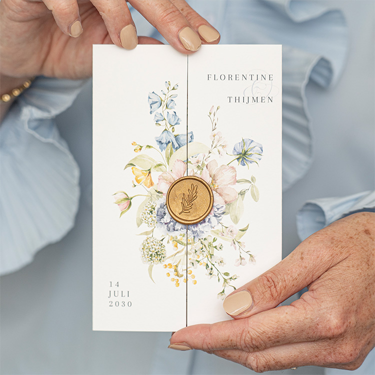 Maak een originele drieluik trouwkaart voor jullie trouwdag. Dit is een klassieke trouwkaart met veel bloemen in blauwe en roze tinten. Je vouwt de voorste twee 'deurtjes' naar binnen toe. Voeg zelf in de editor informatie toe over jullie trouwdag.