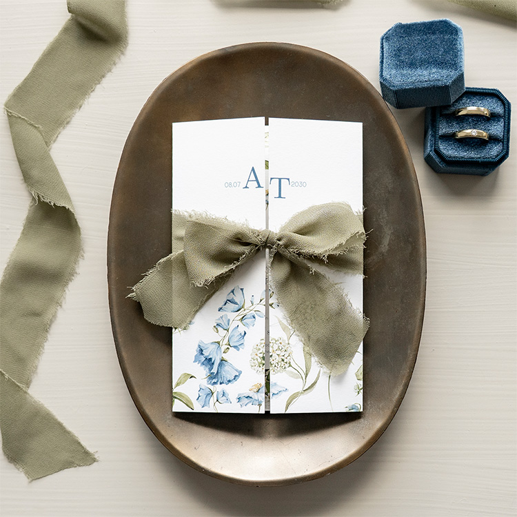 Een elegante trouwkaart drieluik met blauwe bloemen. Personaliseer het ontwerp naar wens in onze online editor. Strik om de kaart een mooi blauw lint.