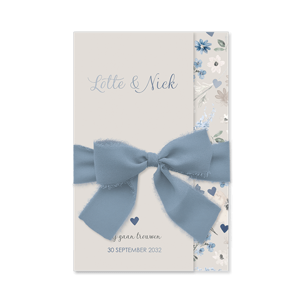 Verstuur een drieluik mapje trouwkaart naar jullie bruiloft gasten. Dit is een beige trouwkaart met blauwe bloemen. De linker en rechterflap vouw je als deurtjes naar binnen. Maak met behulp van icoontjes uit de beeldbank het dagprogramma van jullie bruiloft. Sommige teksten worden in blauw hoogglans gedrukt, wat zorgt voor een extra glimmend laagje op de kaart. Maak de kaart dicht met een blauw lint. Het blauwe lint bestel hier je los bij de trouwkaart.