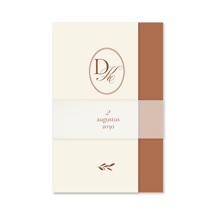 Ontwerp een klassieke trouwkaart als drieluik mapje. De linker en rechter zijde van deze drieluik trouwkaart vouw je naar binnen. Zo ontstaat er een mapje, waar je een wikkel omheen schuift. De wikkel bestel je los bij de trouwkaart. Aan de binnenkant upload je eenvoudig jullie mooiste foto's.