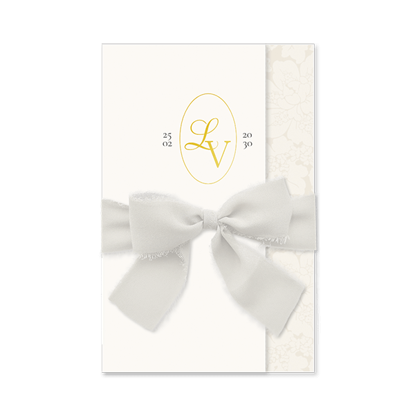 Verstuur een drieluik mapje trouwkaart naar jullie bruiloft gasten. Dit is een beige trouwkaart vintage met een logo en beige bloemen. De linker en rechterflap vouw je als deurtjes naar binnen. Maak met behulp van icoontjes uit de beeldbank het dagprogramma van jullie bruiloft. Sommige teksten worden in goudfolie gedrukt, wat zorgt voor een extra glimmend laagje op de kaart. Maak de kaart dicht met een wit lint. Het witte lint bestel hier je los bij de trouwkaart.