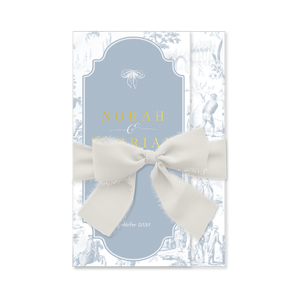 Bestel een vintage trouwkaart voor jullie bruiloft. Dit is een trouwkaart drieluik mapje waarbij je de linker en rechterzijde als deurtjes naar binnen vouwt. Op deze trouwkaart vintage met Toile de Jouy worden teksten in goudfolie gedrukt, wat zorgt voor een chique look. Strik een wit lint om de trouwkaart om de kaart dicht te maken. Het witte lint bestel hier je los bij de trouwkaart.
