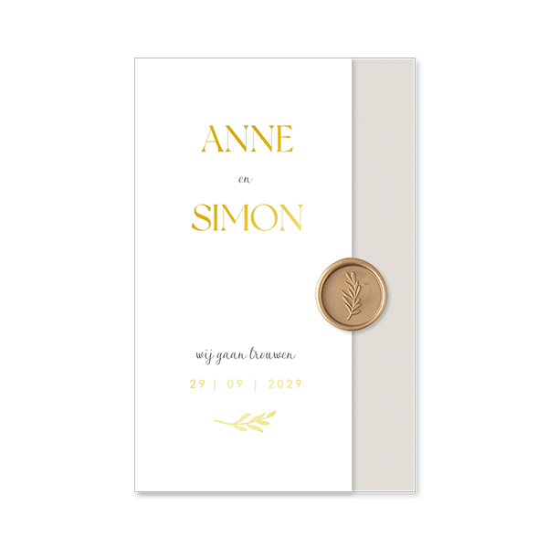 Stijlvolle drieluik trouwkaart met goudfolie en lakzegel