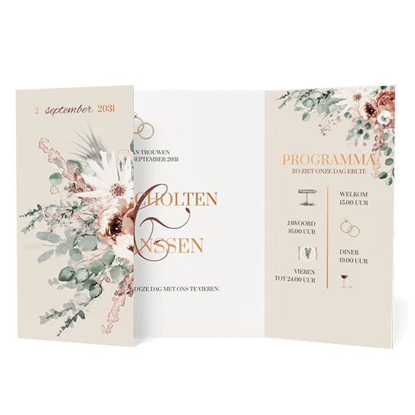 Ontwerp een drieluik trouwkaart in vierkante vorm. Dit is een bloemen trouwkaart met deurtjes die je op en kan vouwen. Zo is er genoeg ruimte voor alle informatie over jullie trouwdag. Maak met behulp van icoontjes uit onze beeldbank het programma van jullie dag. Sommige teksten worden in glimmend koperfolie gedrukt.