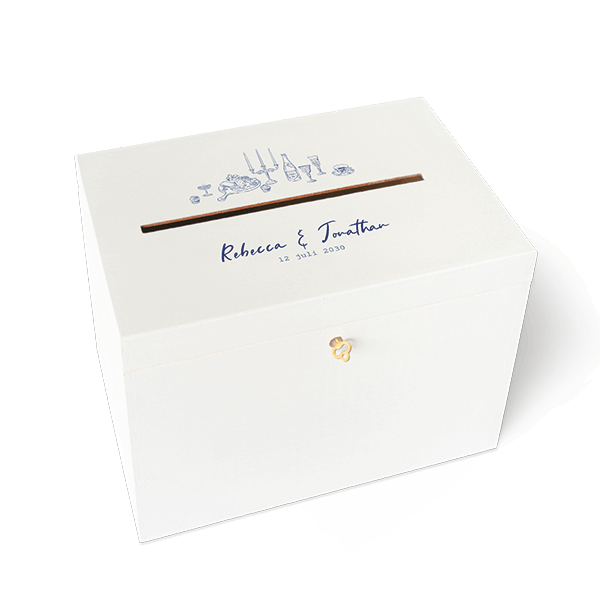 Bestel een handige enveloppendoos voor jullie bruiloft met getekende icoontjes.| Totaalprijs: 0 |
