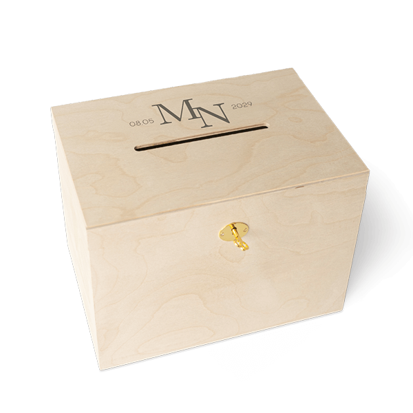 Ontwerp een bruiloft enveloppendoos van hout. Dit is een klassiek ontwerp met logo, pas het ontwerp naar wens aan in onze online-editor.
