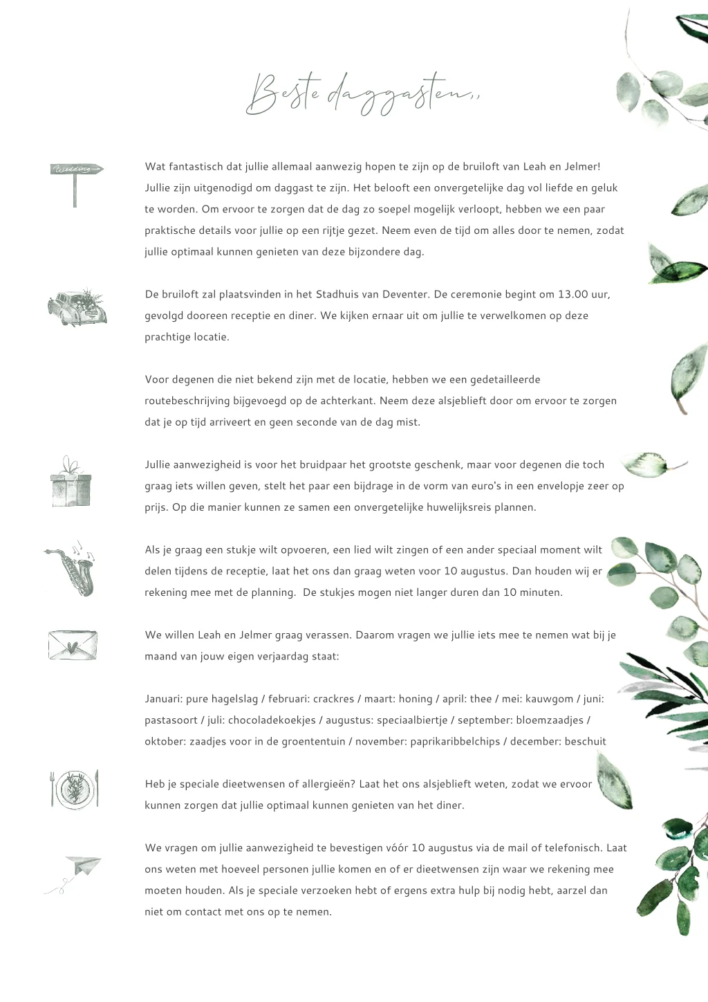 Ontwerp een extra informatie kaart in A4-formaat. Dankzij dit formaat heb je genoeg ruimte om alle informatie over de dag te noteren. Je kan ook de achterkant gebruiken. Dit ontwerp past bij een botanische trouwuitnodiging in dezelfde stijl.