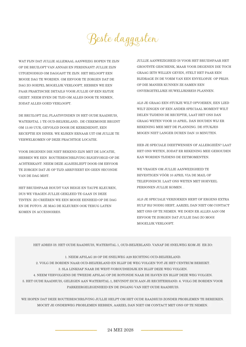 Bestel een handig inlegvel bij je trouwkaart. Op dit papier in A4-formaat kunnen de ceremoniemeesters alle informatie voor (dag)gasten kwijt. Dit is een stijlvol ontwerp, passend bij een trouwuitnodiging in dezelfde stijl. Op de achterkant kan je een persoonlijke foto uploaden.