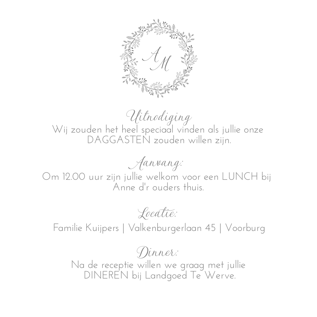 Jullie willen een aantal gasten speciaal uitnodigen om daggast te zijn. Voeg daarom dit stijlvolle extra kaartje bij jullie klassieke trouwkaart met de belangrijkste informatie. Natuurlijk is deze kaart ook te veranderen voor jullie receptiegasten of feestgasten.