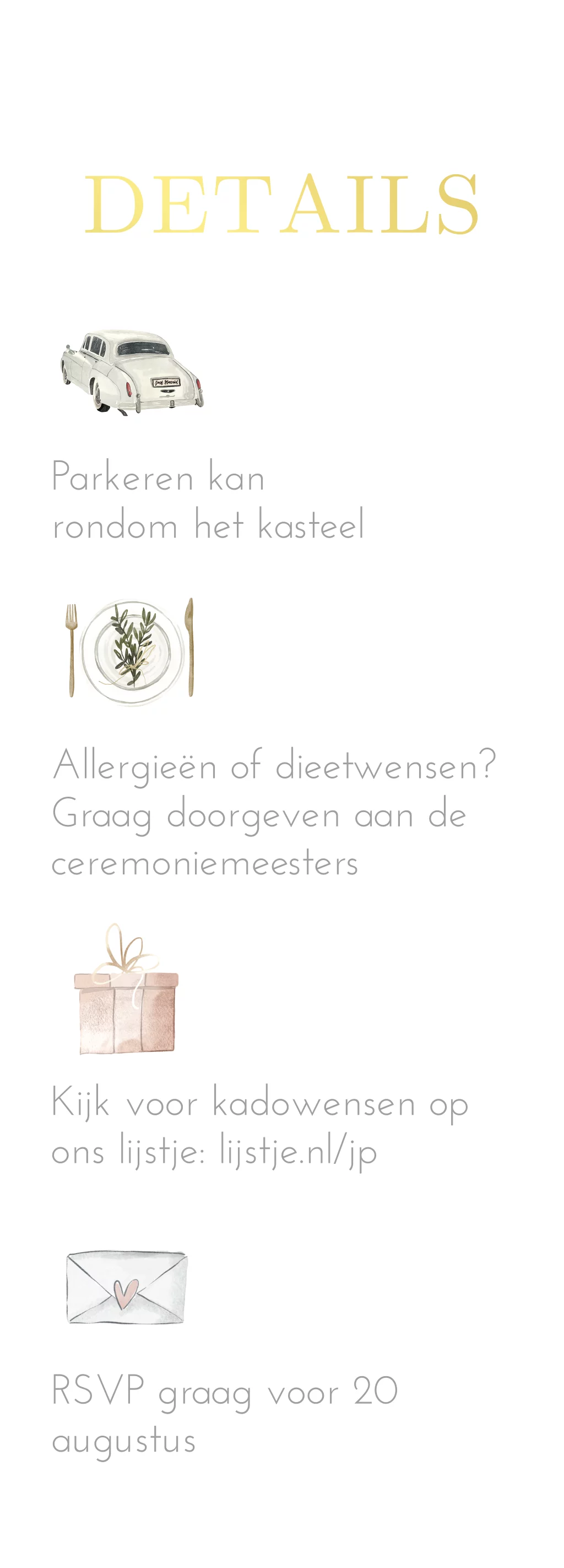 Dit is een extra kaartje voor bij de trouwkaart. Op dit klassieke kaartje zet je extra informatie over de trouwdag. De tekst wordt in goudfolie gedrukt. Op de achterkant van dit strookje voeg je makkelijk persoonlijke foto's toe.