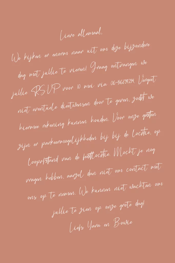 Bestel een extra informatiekaartje voor jullie bruiloft. Dit is een romantisch kaartje, met tekst die handgeschreven lijkt te zijn. Zet er informatie op zoals parkeergelegenheid, de route en cadeauwensen.