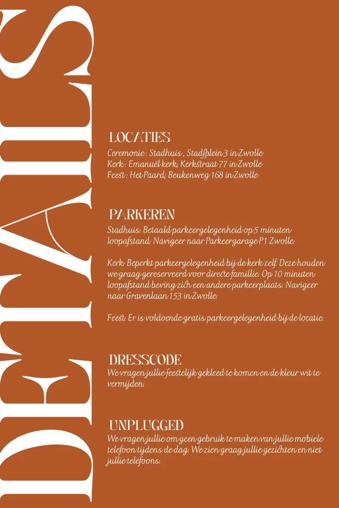 Ontwerp een extra kaartje voor informatie over de trouwdag. Dit is een modern kaartje in peach fuzz kleur, passend bij een trouwkaart in dezelfde stijl.