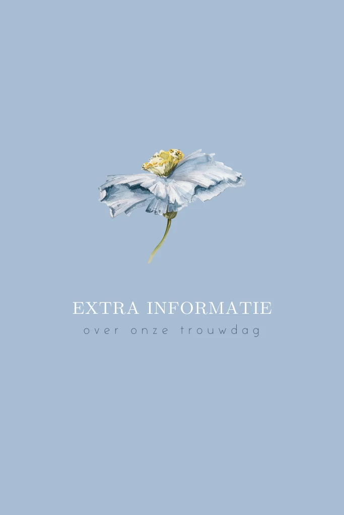 Deze blauwe extra informatiekaartje met bloemen maakt deel uit van een trouwkaartenset.