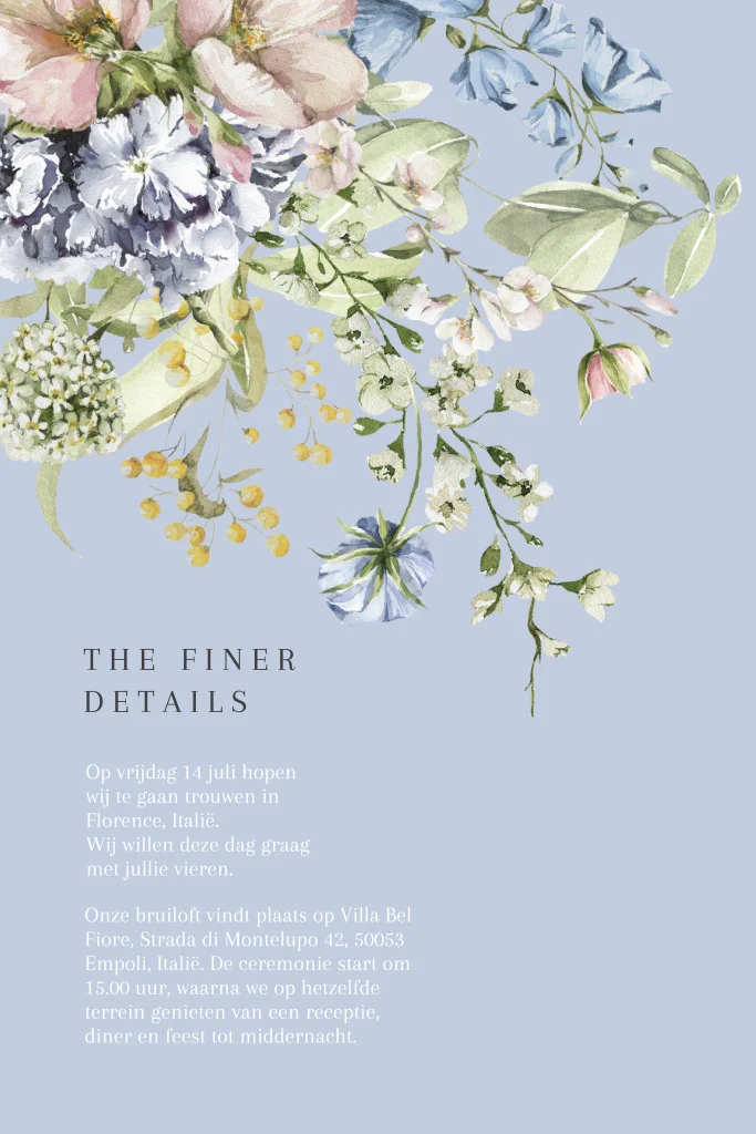 Dit extra informatiekaartje met bloemen maakt deel uit van een trouwkaartenset.