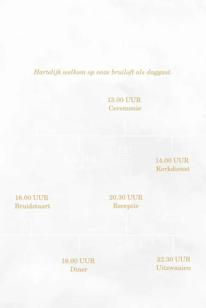 Bestel een extra kaartje bij de trouwkaart met het dagprogramma. Dit is een stijlvol kaartje voor daggasten met het programma in goudfolie. Het daggasten kaartje verstuur je met de trouwkaart.