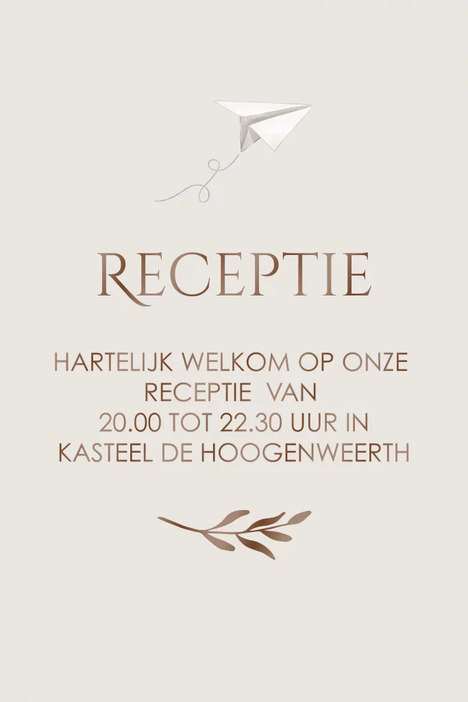 Ontwerp een extra kaartje bij de trouwkaart in beige met een blaadje. Zo kan je extra informatie over de bruiloft kwijt.| Totaalprijs: 0 |