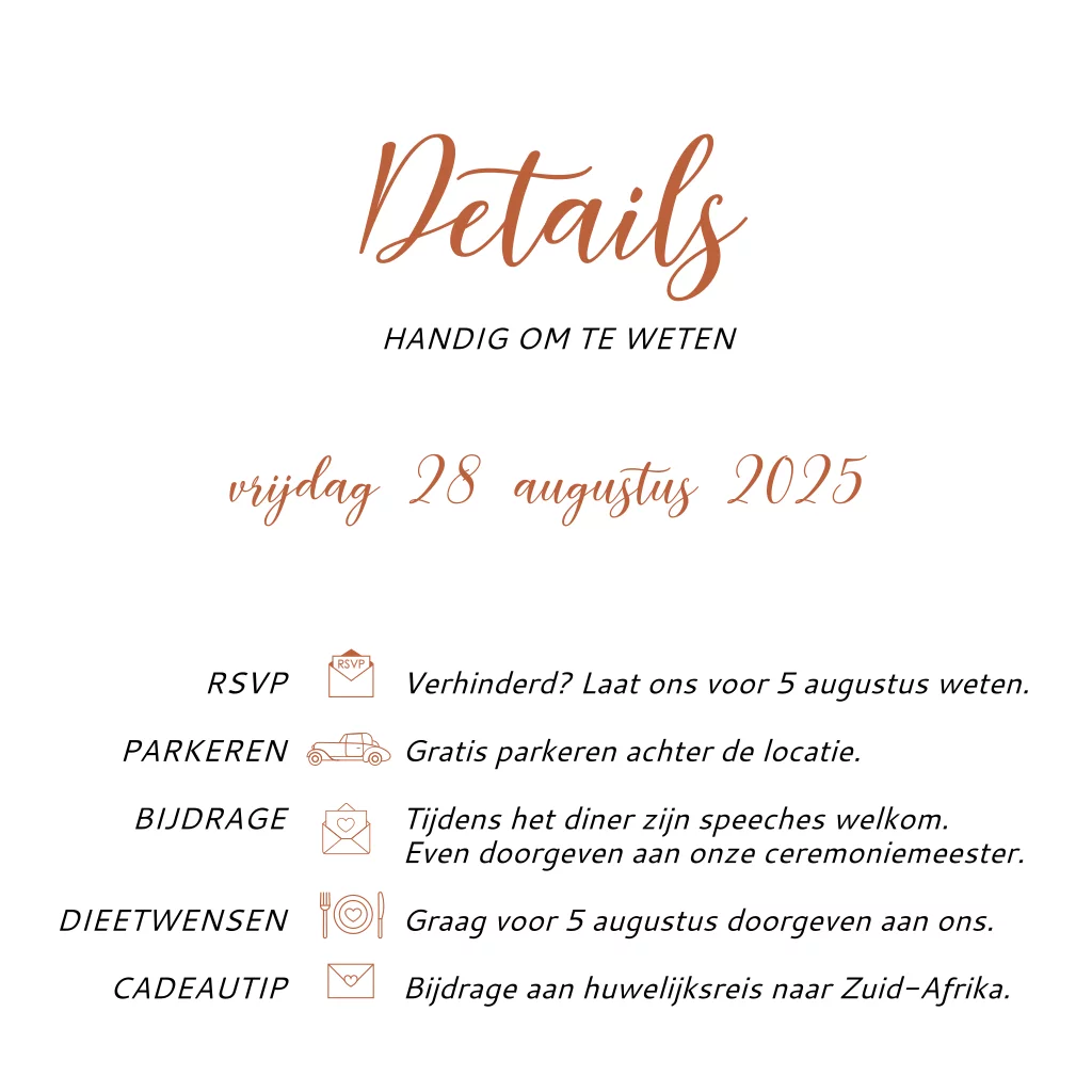 Een extra kaartje bij de trouwkaart in roestbruine kleur. Op dit informatiekaartje kun je alle informatie voor de gasten kwijt. Maak je eigen teksten met icoontjes als ondersteuning. Mis je een icoontje? Laat het ons weten.