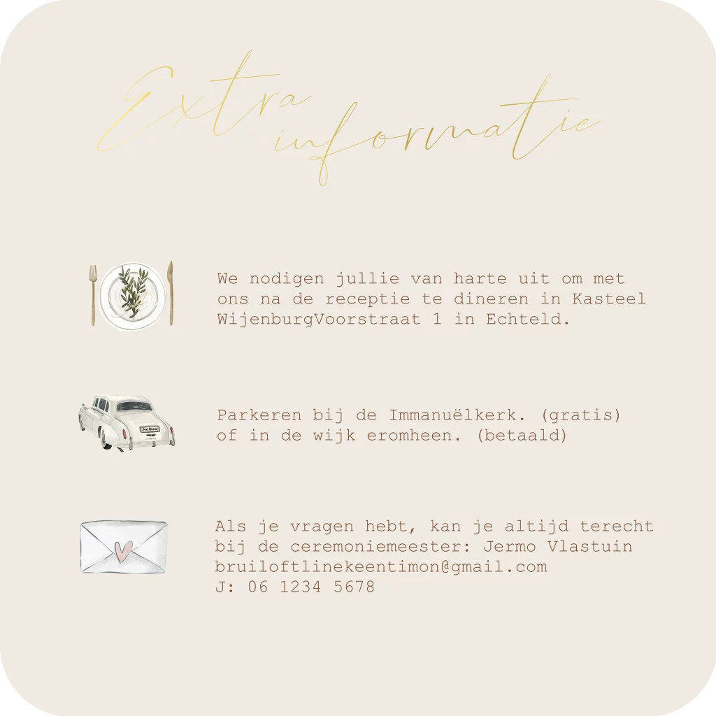 Voeg een stijlvol extra kaartje toe bij je trouwkaart met alle extra informatie. Dit is een vierkant kaartje met icoontjes en goudfolie. Alle teksten en icoontjes kan je aanpassen in de editor.