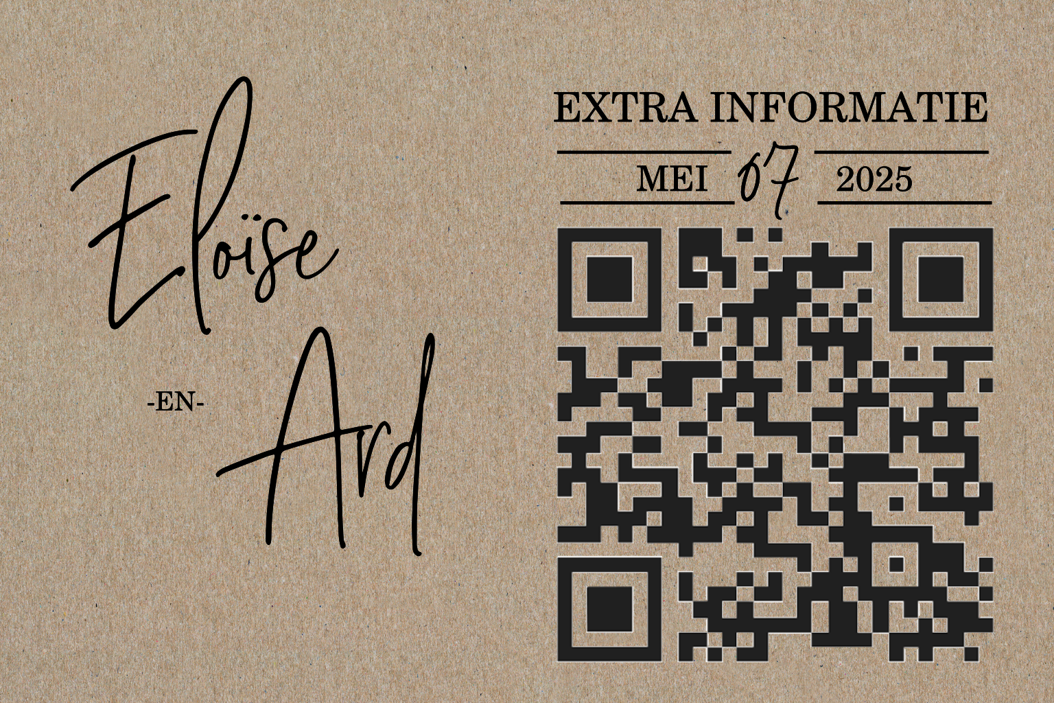 Ontwerp een handig extra kaartje met een qr-code. Dit is een extra kaartje in kraft papier. Gasten kunnen de qr-code scannen voor meer informatie. Achter de qr-code kan je bijvoorbeeld een website of pagina met informatie voor de bruiloft zetten.