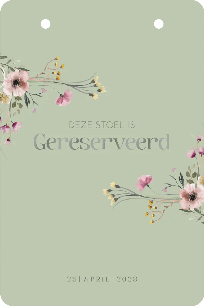 Maak een kleurrijk gereserveerd kaartje met bloemetjes en de tekst in hoogglans. Dankzij gaatjes kan je de kaartjes handig ophangen aan de stoelen.