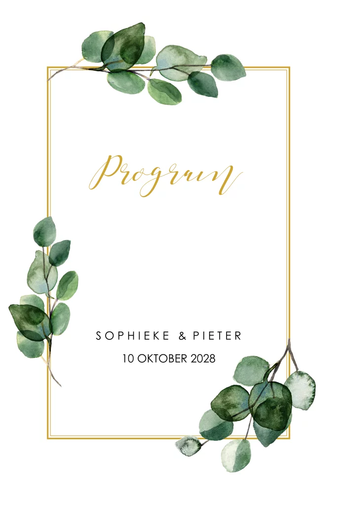 Ontwerp een extra informatie kaartje met het programma van de dag. Dit is een kaartje met goudfolie en blaadjes, in de stijl van een trouwkaart.| Totaalprijs: 0 |