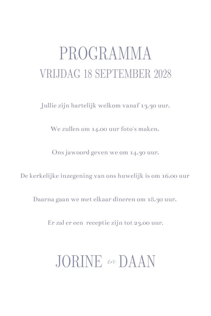 Ontwerp een extra kaartje met het programma van de trouwdag bij de trouwkaart. Dankzij dit moderne programmakaartje in lila tinten weten de gasten wie als daggast uitgenodigd is.| Totaalprijs: 0 |