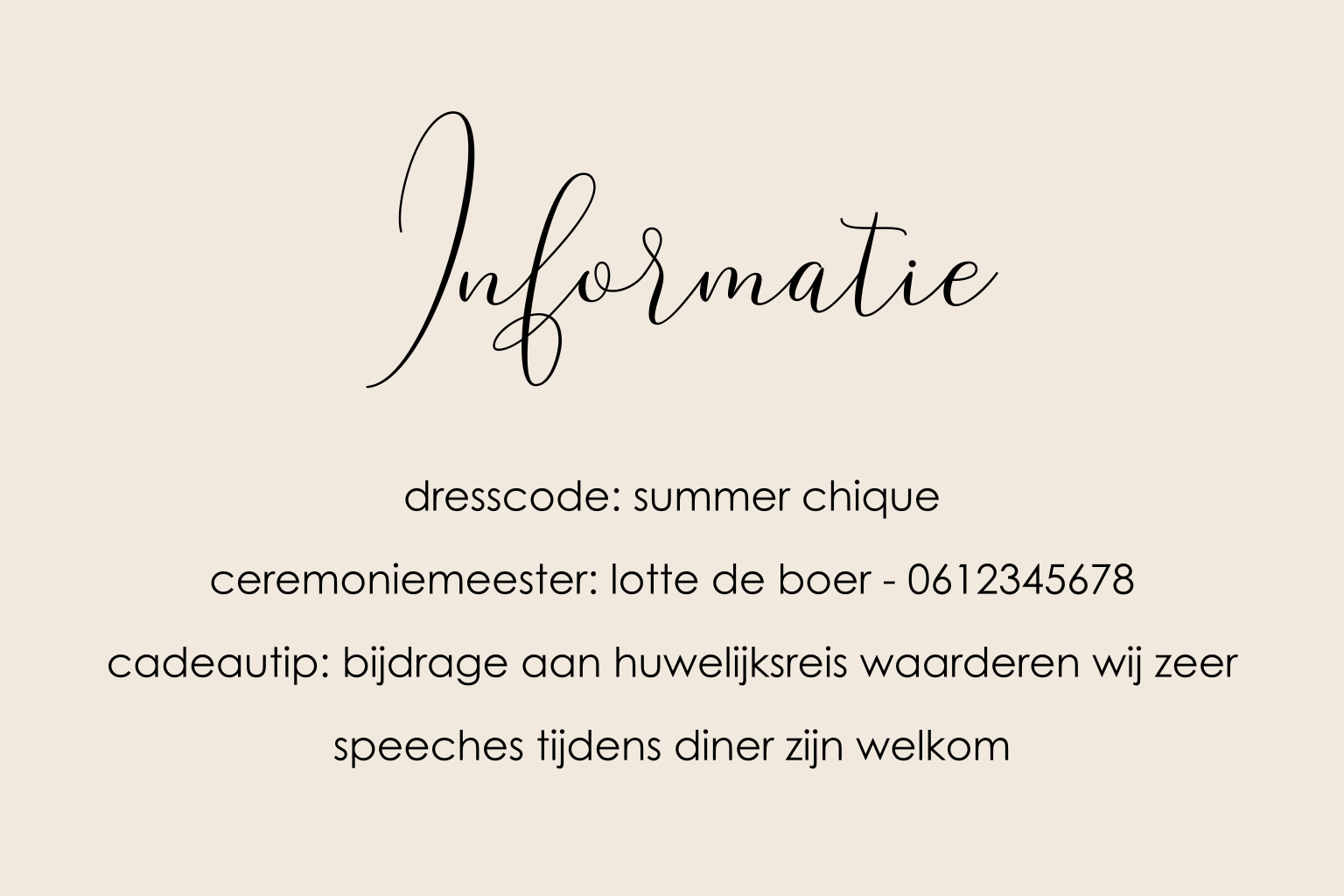 Bestel dit kaartje op het formaat 5 bij 8 cm en voeg deze bij de trouwkaart. Je kunt eigen informatie op dit kleine kaartje kwijt. Bestel altijd een proefdruk om te kijken of de tekst leesbaar is.