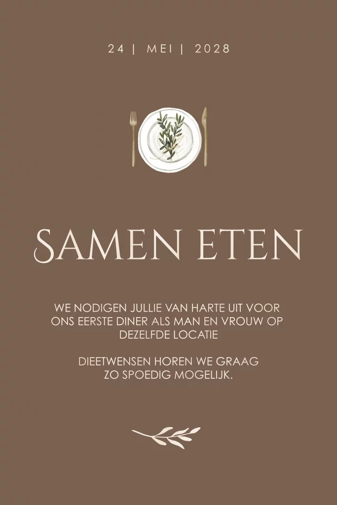 Voeg een kaartje bij de trouwkaart zodat je extra informatie kunt delen met gasten. Dit is een stijlvol kaartje in bruine tinten met een takje.