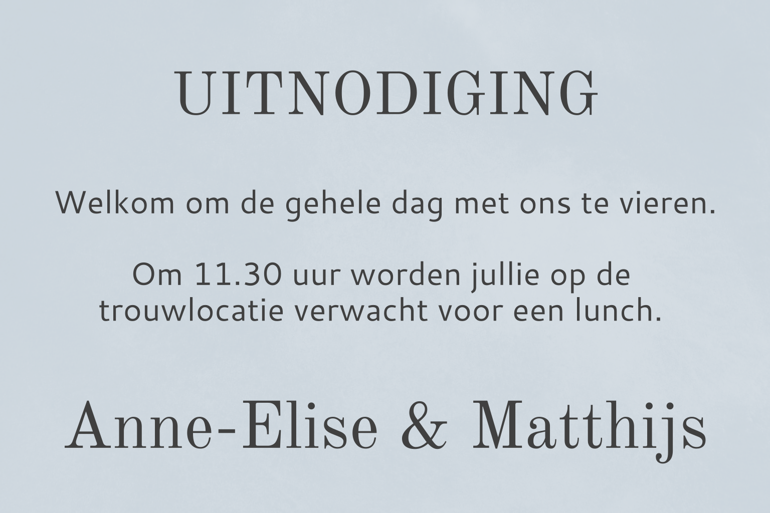 Voeg bij de trouwkaart dit kleine kaartje. Het kaartje kun je laten drukken op 8 bij 5 cm. Daarom is de tekst zo groot op het kaartje gezet: in de drukkerij wordt het ontwerp verkleind. Bestel altijd een proefdruk om te kijken of de tekst leesbaar is. Dit is een kaartje om daggasten uit te nodigen, maar je kun natuurlijk ook uitnodigen voor het diner o.i.d.