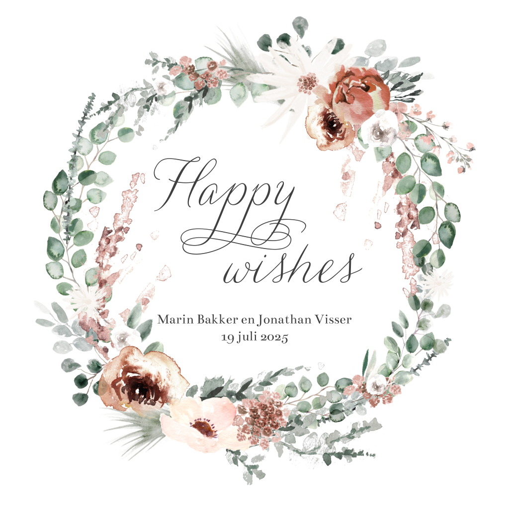 Een bohemian wenskaartje met een bloemenkrans. Laat jullie gasten dit kaartje met wensen en lieve woorden invullen. Een mooie herinnering aan de bruiloft. We adviseren het formaat 11 bij 11 cm.