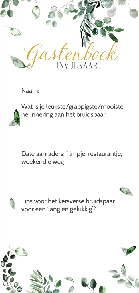 Stel de leukste vragen op deze invulkaart. De antwoorden zullen een prachtige herinnering geven aan jullie trouwdag.