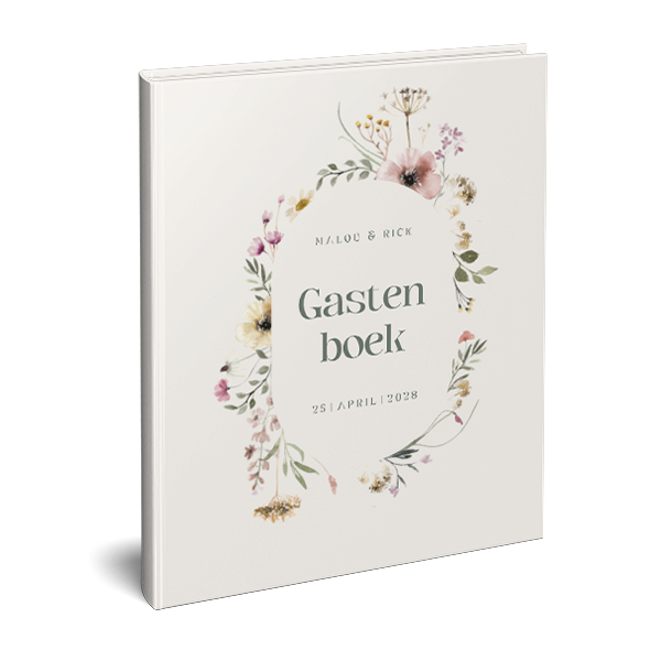Ontwerp je eigen gastenboek met een bloemenkrans. Dit gastenboek past bij een trouwkaart in dezelfde stijl.
